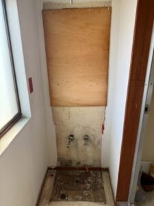 こちらは3階建ての建物で、1階が店舗、2階が事務所で使用されており、2階に備わっている洗面台やお風呂はほとんど使用されてこなかったそうで、ある日蛇口をひねったら水漏れが起こったとのこと。