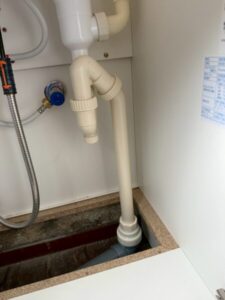 排水パイプと配管の接合部分も管接続用のジョイントで水漏れがおこらないようしっかりと設置しております。